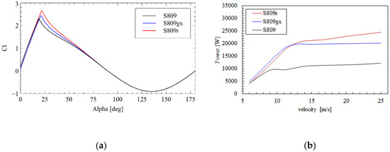 The lift coefficients corrected with the 3D correction law at each airfoil are extrapolated with the Viterna method, as shown in Figure 24a. This extrapolated polar data is located in the inboard region at r/R = 0.23. In this section, the chord to radius ratio is large, causing the stall to be delayed significantly for all three airfoils. The power distributions from the three wind turbines with the blades of the airfoil S809, S809gx, and S809r are calculated by the BEM method. The wind turbine with the airfoil S809gx shows about two times higher power and the turbine with the airfoil S809r produces c.a. 2.3 times higher power than the reference wind turbine, as shown in Figure 24b. The wind turbine with the airfoil S809r shows the most considerable increase in the higher velocity.