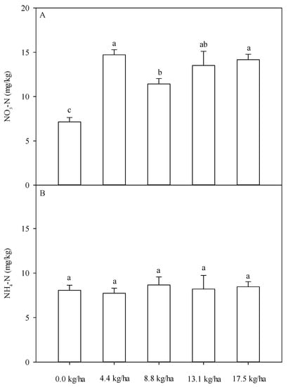 Soil concentrations of NO3-N and NH4-N in a “Nero” black chokeberry field as affected by five rates of application of oil cake. Different lower-case letters on each datum point for each phase indicate significant differences as determined by Duncan’s multiple range test at p ≤ 0.05. Bars represent the error of the means.