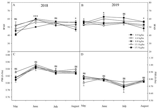 Seasonal SPAD and PS II activity of a “Nero” black chokeberry from May to August as affected by five rates of the application of oil cake. (A) Seasonal SPAD in 2018, (B) Seasonal SPAD in 2019, (C) PS II activity in 2018 and (D) PS II activity in 2019. *, *** adjacent to each datum point for each sampling time indicate significant differences, as determined by Duncan’s multiple range test at p ≤ 0.05 or 0.001, respectively; ns, not significantly different.