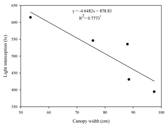 Linear regression analysis of the relationship between the canopy width and light interception of a “Nero” black chokeberry in mid-July, as affected by five rates of application of oil cake. * Significantly different at p ≤ 0.05.