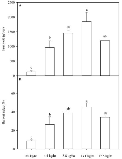 Fruit yield and harvest index of a “Nero” black chokeberry as affected by five rates of application of oil cake. Different lower-case letters on each datum point for each phase indicate significant differences, as determined by Duncan’s multiple range test at p ≤ 0.05. Bars represent the error of the means.