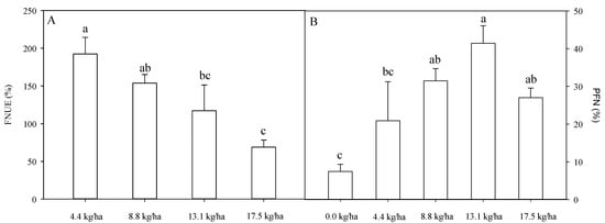 Fertilizer T-N use efficiency (FNUE) and the percentage of fruit T-N partitioning (PFN) of a “Nero” black chokeberry, as affected by five rates of application of oil cake. Different lower-case letters on each datum point for each phase indicate significant differences, as determined by Duncan’s multiple range test at p ≤ 0.05. Bars represent the error of the means.