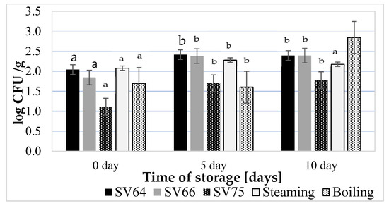 The raw chicken breast was characterized by satisfactory microbiological quality (Figure 1). The initial (0 days) TVC load of a raw chicken breast was 3.9 log10 CFU/g, while yeast and mold counts were—3.5 log10 CFU/g (not presented in Figure 1). Pathogens: coagulase-positive Staphylococcus, E. coli, Listeria monocytogenes, Enterobacteriaceae, and Salmonella spp. were not detected in any raw or cooked samples on the day of preparation as well as on days 5 and 10 of storage.