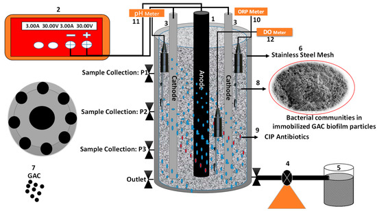 The schematic view of the three-dimensional bioelectrochemical reactor system (3D-BERs) was used in this study to evaluate the biodegradation of ciprofloxacin and nitrates removal from Low C/N wastewater (Figure 1). The reactor was made of a plexiglass cylinder with a diameter of 10 cm, a height of 20 cm, a total volume of 1.2 L and a working volume of 0.785 L. The cathode consisting of eight graphite rods (with a height of 20 cm and diameter of 0.8 cm) were placed around the periphery of the reactor, while the one graphite rod (with a height of 20 cm and diameter of 1.5 cm) as an anode was fixed in the center of the reactor and was connected using insulated electrical copper wire by DC-power. A DC-controlled power supply: Model No: HQ3003SIII, supplied by Hansheng Puyuan Technology Beijing Co., Ltd. (Beijing, China), (with the ranges 0–3 A and 0–30 V) was used. Electrolysis of water is the decomposition of water into hydrogen (H2) and oxygen (O2) due to the passage of an electric current. Meanwhile, from top to bottom, space was filled with granular activated carbon (GAC) functioning as third particle electrodes (size 1.5–3 mm) used for microbial growth that were purchased from Younga Chemical Technology (Nanjing, Jiangsu Co., Ltd., China). The GAC was the best option for the development of bacteria on the cathode and anode on the inner zone and on the bottom zone in the reactor. The pre-treatment of GAC was washed several times with deionized water via a sulfuric acid solution (0.01 M) and then dried for 24–30 h, and was finally heated to 110 ℃.