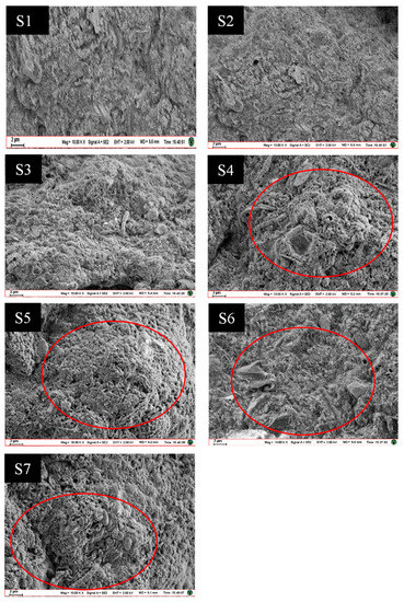 For the next stage, we washed the GAC biofilm, dried it and added 7 mL of 20%, 40%, 50%, 70%, 80%, and 90% ethanol each following 10 min periods. Biofilm samples were dehydrated three times, while 7 mL of ethanol (100%) after 15 min each time. Afterwards, a 7 mL blend of ethanol and acetyl (Ethanol: Isoamyl acetate ratio = 1:1) was discharged into the C.T for 15 min. Finally, we placed the 10 mL samples on filter paper and dried them in a vacuum dryer (Mecha-Tech system Ltd., Bristol, UK) for 24 h at a pre-cooling temperature of 10 ℃ [23,39]. Then the coating (10 nm gold layer) sample was examined with Hitachi S-4300 FEG-SEM (Bavaria, Germany, Europe), and the images were collected digitally. The SEM images are shown in Figure 2, including the morphology of biofilm attached to granular activated carbon (GAC) particle electrodes in the 3D-BERs. The GAC had a high specific area of about 450–900 m2 g−1 and a porous structure to facilitate the growth of microbial attachment was reported [20,28,40]. The biofilm samples of the S4, S6 and S7 were abundant compared to the S1, S2, S3 and S5, corresponding to the thicker bacterial community at 60 mA [41]. In the S1 to S3 zones, the microbes were reduced in quantity due to lacking electron donors. It was found that in the 3D-BERs with GAC, biofilm was imbedded due to the abundance of microbial activity [40]. This was clearly observed in rod-shaped graphite anode and cathode, which was authentic and common in the other denitrification system [20,42]. There were also giant microbes found, which may be hydrogen-heterotrophic denitrifying bacteria.