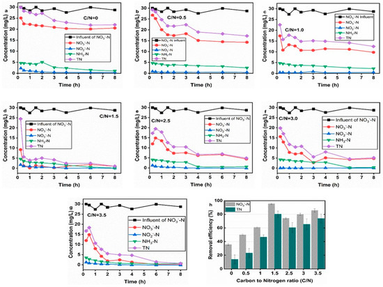 Organic carbon sources are known to be limiting factors for heterotrophic denitrification. The removal of nitrate and total nitrogen increases as the ratio of C/N increases [22]. At the maximum level, the C/N ratio endorses the development of heterotrophic-denitrifying microorganisms, thereby allowing denitrification [21,22,47,48]. If there is a shortage of organic carbon during this period, then the nitrogen removal will usually decrease, and the NO2−-N reductase competes with the electron donor nitrate reductase at a low level of C/N ratio. The reductase of nitrite is more complex and sensitive to the experimental conditions compared to nitrate reductase, resulting in the accumulation of NO2−-N [22].