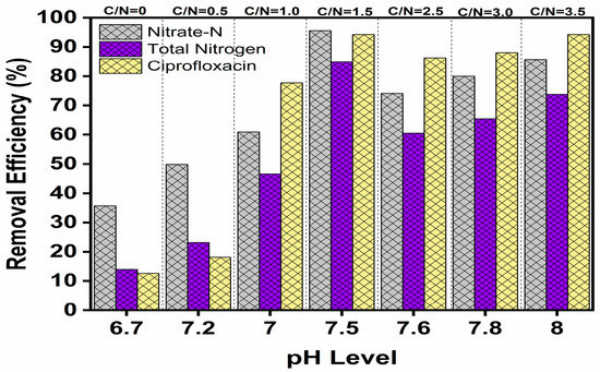 As shown in Figure 4, the influences of various pH values on the average concentration of nitrogen and ciprofloxacin (Total nitrogen, NO3−-N, and CIP) during the C/N ratio in the batch process from 0 to 3.5 and electrical current intensity was I = 60 mA. A series of batch experiments was conducted in 3D-BERs for 70 days of operation in different C/N ratios to evaluate the NO3−-N and CIP removal. In the novel 3D-BERs, the elimination of NO3−-N decreased from 25.07 mg·L−1 to 9.18 mg·L−1 and from 4.41 mg·L−1 to 0.199 mg·L−1, and for CIP there was a reduction from 377.5 µg·L−1 to 106.36 µg·L−1 and from 115.9 µg·L−1 to 106.3 µg·L−1 while the C/N was between 0 to 1.5 and 2.5 to 3.5 at the pH range of 6.0 to 7.5 [19,20,40,44]. Under those conditions, the maximum removal efficiencies of NO3−-N, TN and CIP were found to be 35.66% to 95.55%, 13.93% to 80.27% and 12.59% to 94.20%, while the C/N ratio was between 0 to 1.5 and 2.5 to 3.5 at a electric current intensity of 60 mA, respectively [19,48,52]. The maximum antibiotic CIP removal efficiency could be reached at 84.61% and 94.20% when the C/N was 3.5 and 1.5 at pH values of 7.0 to 7.5. In this system, the highest removal rate was at pH 7.5 as compared to a pH value of 6.7 to 8.0 [37,40]. However, pH played a pivotal role in ciprofloxacin degradation and gradually NO3−-N removal. It was observed that the average concentration of CIP in influent was decreased from 377 to 106.36 µg·L−1 and 115.9 to 116.99 µg·L−1 when the C/N ratio shifted from 0 to 1.5 and from 2.5 to 3.5. At the C/N = 1.5 and 3.5, the final effluent of CIP concentrations was 106.36 µg·L−1 and 116.99 µg·L−1, respectively, as shown in Figure 5 [50,53,54]. It was shown that denitrification inhibited CIP, and that development was more obvious during the prolonged microbial cultivation period [6,55,56].
