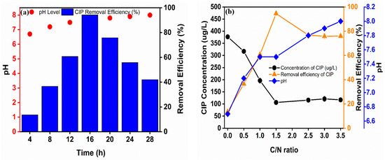 The removal efficiency of (a) CIP antibiotics, and (b) concentration in the 3D-BERS (i.e., experimental conditions: C/N = 0–3.5, pH = 6.0–8.2).