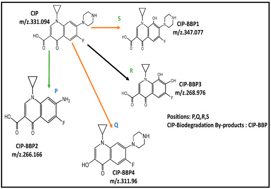 After solid-phase extraction (SPE in Germany), biodegradation experiments on ciprofloxacin antibiotics were performed by using LC-MS/MS. Nevertheless, the LC-MS/MS identified a total of four CIP biotransformation products developed by LC-MS/MS: LCQAD-6460, Agilent Technologies, Santa Clara, CA, USA (the molecular structure and intermediates of these products are revealed in Table S1, and the total ion chromatogram (TIC) is demonstrated in Figure S1). These four possible biodegradation pathways of the antibiotic ciprofloxacin are shown in Figure 6. Moreover, in this pathway, C2H2 with a piperazinyl substituent of CIP is removed by using demethylations to generate CIP-BBP1 at the pathway point “S” and is transferred to CIP-BBP4 at the conduit point “Q” by the loss of the C2H5N fragment of CIP-BBP1 (Table S1). While the biodegradation of CIP intermediates products involved CIP-BBP1 and CIP-BBP4 as previously reported [16,58], similar products were also identified in 3D-BERS. In the first time of this study, these products were investigated and have not been listed in the literature. In the pathway at point “S”, CIP-BBP1 is shaped via hydroxylation (-OH) at the CIP-BBP1-S position, and CIP-BBP4 is also shaped via hydroxylation at the CIP-BBP4-Q position by replacing the piperazinyl group of CIP-BBP1with CIP-BBP4, as presented in Table S1. In the P and Q-points pathways, CIP-BBP2 and CIP-BBP4 were investigated by substituting for both the fluorine at the P-position of CIP [15] and the carboxyl group at the Q-position of CIP with hydroxylation. Meanwhile, the biodegradation of CIP by acetylation of the NH group of piperazine rings caused inactivation of enzyme culture, i.e., it caused the CIP-acetylation process [59]. Therefore, the 4-pathways can be divided into two main reactions: Piperazinyl-substituent decomposition reactions (a), and hydroxylation reactions (b). Figure S1 indicated that the biodegradation mechanism of antibiotic CIP was proposed in the 3D-BER system. Almost all CIP can be converted into the four products mainly through degradation and hydroxylation of the piperazinyl substituent.