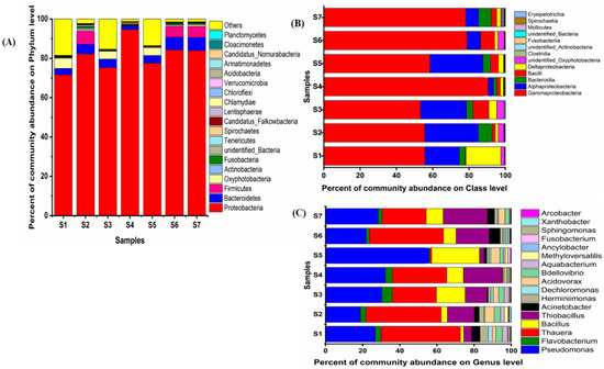 According to S1 samples of Firmicutes (0.011%) obtained was less abundant [15] than the number of S7 samples (5.63%). The relative abundance of class levels is shown in Figure 7B using taxonomic classification.