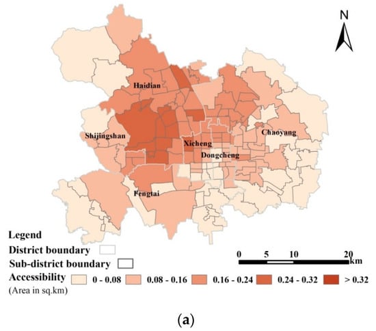 In the public transport mode, the dense distribution of public transport routes corresponds to greater accessibility, and vice versa. High accessibility sub-districts are mainly distributed in the central to the north of the study area, because these areas are old urban areas, with the most complete public transport facilities and the densest metro and public transport lines. Compared with these areas, the south of the study area has relatively low accessibility. This demonstrates that the development of the northern part of Beijing’s central urban area is better than that of the southern part, which further forms a more complete transportation infrastructure.