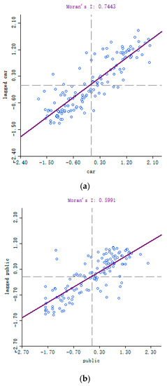The Moran scatter diagrams of accessibility index in different modes in urban area of Beijing, China. (a) Car driving mode; (b) public transport mode; (c) the mixed mode.