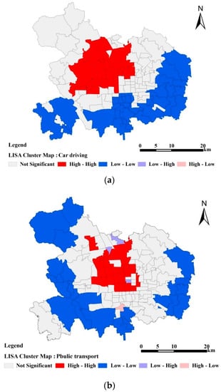 Local Indication of Spatial Association (LISA) cluster map of accessibility index in urban area of Beijing, China. (a) Car driving mode; (b) public transport mode; (c) the mixed mode.