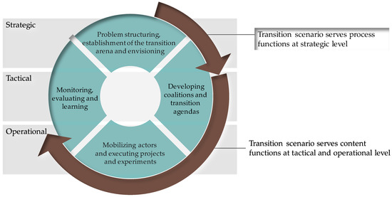 At all three levels, but particularly at the strategic activities level, the design of “transition scenarios” is an important conceptual tool that is increasingly highlighted in the literature. Transition scenarios are defined as participatory explorations of possible development trajectories that incorporate a structural system change towards a desired, sustainable, future state of the system [33]. As plausible, coherent narratives toward achieving transition visons, these scenarios can be embedded in the process of envisioning the transition management cycle (process functions) (Figure 1). The developed transition scenarios can also support downscaling long-term desirable future visions at the strategic level into transition agendas at the tactical level as well as practices and experiments at the operational level (content functions) (Figure 1). Transition scenarios can not only help engage and align stakeholders, but they can also prepare more resilient strategies by anticipating deviations from current trends [32,33,34,35,36].