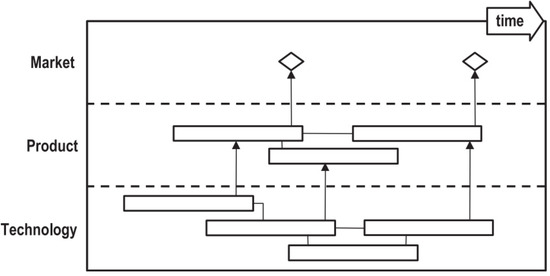 TRM is a widely implemented flexible technique for industry and practitioners to support long-term strategic planning and R&D [37,38,39,40]. TRM aims to forecast social, market, and technology changes to develop strategies that ensure its survival in the current dynamic and uncertain environment. While TRM can be defined as a roadmapping process, i.e., a set of activities to develop a “roadmap,” the roadmap is the outcome of the process. The generic architecture of a roadmap consists of a two-dimensional concept: a horizontal axis timeline and vertical axis multi-layers [38] (Figure 2). The roadmaps serve as graphical means for exploring and communicating dynamic interplay among technological resources, organizational objectives, and changing environment [38,41]. These structures can be customized to align with the specific requirements associated with roadmapping activities.