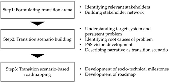Regarding the PSS development project, the aim of developing a vision is not to simultaneously focus on different potential paths as it is in transition management, but to plan specific PSS development [6]. Moreover, while for transition management the typical central actor is the policymaker, in this study the PSS development process is seen from a company perspective. In other words, transition scenario-based roadmapping is seen here as a potential strategic planning technique for companies (and partners) to orient the projects and activities for the implementation of PSS. Additionally, the visions developed in the PSS development project are different from the perspective of a transition study. PSS ideas or concepts represent the goal for stakeholders to achieve [6,15]. These visions are mainly used to communicate the PSS concept among stakeholders within the company and outside actors (e.g., project partners, customers, policymakers, and local authorities).