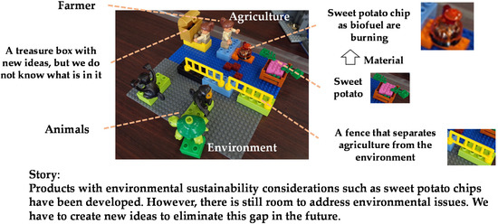 Identify the target system, where the new solution should be implemented, and outline the set of causes that make the system unsustainable. The target system depends on the PSS development project’s first goal. In this activity, stakeholders should exchange their knowledge and ideas through dialogue to share information and perspectives about the current condition of the target system. Nevertheless, not all actors are experts who can express their knowledge and ideas clearly, or who possess specific skills to share with others. Therefore, this step introduces Lego serious play (LSP), a toolkit for actors to express their perspectives and knowledge related to the set theme through hands-on modeling [59,60]. The LSP methodology contributes to generate shared common knowledge by storytelling of each constructed model for other participants and defining relationships among them. Then, develop a list of the causes of persistent problems that make the target system unsustainable based on the results of the LSP workshop. An example of LSP work that represents a present condition in agriculture is shown in Figure 4.