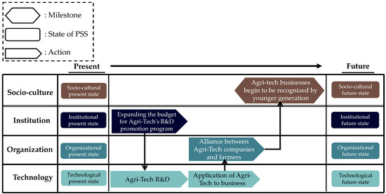 In this step, the transition scenarios developed in the previous phase are translated into a roadmap for PSS development. This step forecasts and visualizes a more concrete strategy that stakeholders serve by linking short-term operational planning to the long-term vision (explorative approach). The format of the roadmap is customized as shown in Figure 6. The suggested roadmap consists of four layers (socio-culture/institution/organization/technology) on the vertical axis and a timeline on the horizontal axis, based on one of the roadmap types identified in [38]. The general components of PSS in TRM—product, service, and technology—correspond to the technology layer. The contents described in the layers are different between the socio-culture layer and the other three layers. In the socio-culture layer as a top layer, milestones of the PSS development are described, whereas the institution/organization/technology layers describe the action plans of the stakeholders for PSS development. This difference is because the passive nature of socio-cultural situations is gradually fostered under the influence of institutional/organizational/technological actions. Moreover, the final aim of the PSS development is to redesign the patterns of production and consumption (“lifestyles”) to make them more sustainable. Cultural shifts in provider, customer, and support networks are vital successful causes for PSS development [5,7]. In other words, the newly formed socio-culture can serve as the driver that fosters the implementation of other institutional, organizational, or technological activities. This step comprises the following three activities: