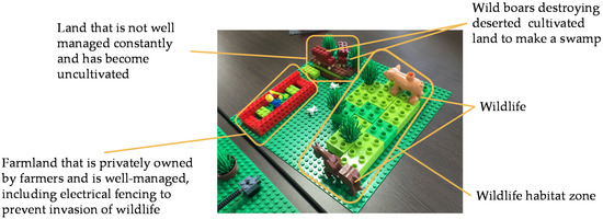 To define the starting point of the transition scenario, step 2 started by identifying the causes of difficulties in measuring the extent of the wildlife damage based on knowledge sharing among the stakeholders. In this case study, Akiruno City was set as the target system because the main purpose of this project is to resolve the wildlife damage occurring in this city. The LSP was held under two themes: (1) wildlife damage in Akiruno City and (2) difficulty implementing countermeasures to curb wildlife damage. Two models were created for each participant, and 10 models were created and shared. Figure 7 shows an example of the LSP model, which shows that wildlife has invaded the human living areas and are destroying crops. The red blocks represent traps installed by local residents, and the human block is placed inside the red blocks to show that the crops are protected. Consequently, 29 causes of wildlife damage were extracted by analyzing the results of the LSP and discussions based on it. The causes include the current state of wildlife damage, such as animal invasion into the human living areas, and those led by social problems, such as aging and population decline.