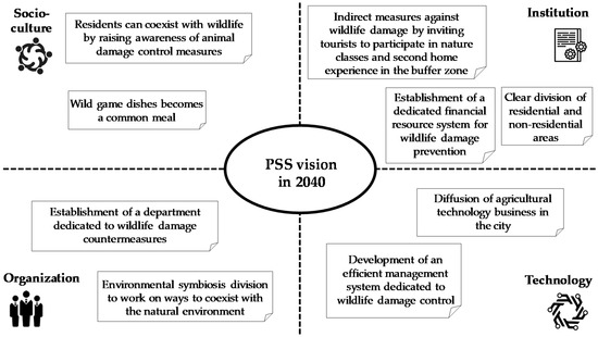 A PSS vision—a future system that has resolved the root causes identified in the previous activity—was developed through dialog based on the LSP in the same way as activity 1. Specifically, this project envisioned the city in 2040 (20 years later) and anticipated the socio-cultural, institutional, organizational, and technological states of that future without the constraints (Figure 9). As a socio-cultural vision, project members set the goal of fostering a cultural value that enables residents to coexist with wildlife by raising awareness of animal damage control measures. The institutional vision included (1) indirect measures against wildlife damage by inviting tourists to participate in nature classes and second home experience in the buffer zone, (2) the establishment of a dedicated financial resource system for wildlife damage prevention, (3) a clear division of residential and non-residential areas, and (4) the establishment of a circular system to utilize captured wildlife. Accordingly, the establishment of a department dedicated to wildlife damage countermeasures and an environmental symbiosis division to work on ways to coexist with the natural environment were developed as part of the organizational vision. Regarding the technological aspects, an efficient management system dedicated to wildlife damage control was developed and the agricultural technology business was diffused in the city.