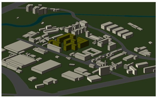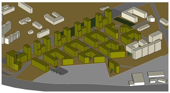 Example 2 (Figure 6), constitutes the construction of the Avia Estate and buildings on Orliński Street, carried out by one developer. Work began in 2011 and two years later the first stage of the development began, eventually resulting in the construction of 28 blocks on approximately 14 hectares, creating 3500 new housing units. To date, 18 seven- and 15-storey buildings have been constructed, mainly 1–2-room and 3-room apartments. Fifteen-storey buildings are taller than others in the area [25].