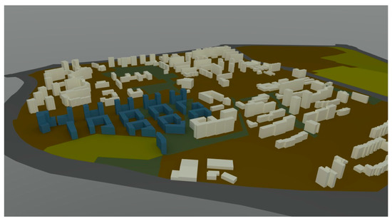 In order to illustrate the impact of space development [19], data obtained under the CAPAP project [20] were used in both cases to study an area of the city of Krakow. The result of this program was an application presenting the 3D model of buildings in the CityGML 2.0 standard, at the level of detail LoD2 (geometric model, buildings have the roof shape selected). The 3D model is based on 2D outlines of buildings from the topographic object database (BDOT10k) [21], altitude data from lidar aerial laser scanning at the density of 12 points per square metre and a numerical terrain model (NMT) with a one metre mesh grid. The model is complemented by the boundaries of the registration plots with their numbers and details of ownership [18,20].