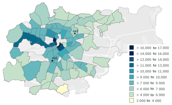 The data provided by the developers were also used. The areas analysed were characterized by a similar period of construction, located at similar distances from the main characteristic points of the city, were in close proximity to commercial centres and had similar availability of public transport. Both investments used buildings similar to the shape of letter U or L, where there was suspicion of mutual obscuration of the building blocks. The available land was assessed in terms of its use, in accordance with the idea of a smart city, whether it has been developed in a purposeful and attractive way for the inhabitants and whether green areas have been respected [13,14,15,16]. Having considered solely the average property prices on the primary market, it was noted that Example 2 was characterized by undervalued prices, compared to the average prices in its area, whereas Example 1 did not create an enclave of prices and was in line with average prices in the area (Figure 3). On this basis, the untapped investment potential of Example 2 may be inferred [17].