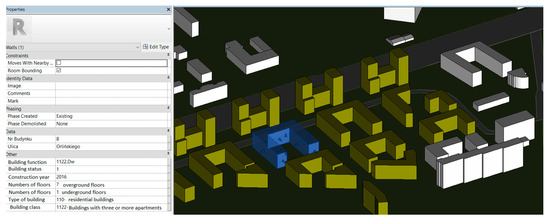 Global parameters were introduced during the execution of the model, so it would be possible to add data for details such as address, building function, year of construction, number of stories (Figure 4). Thanks to the assigned characteristics, any filtration of objects is possible, based on specific parameters. The wide graphic possibilities allowed for the distinction of objects belonging to the investments, studied against the background of adjacent buildings. This was not feasible for CAPAP [18].