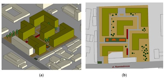 The Fi estate was built in two stages, the end of the first stage was constructed in the last quarter of 2013, while the entire development was completed during the winter of 2015. In the first phase, two seven-storey blocks were built, during the next stage an additional three buildings with the same number of storeys were built. The height of the building was not distinguished among the existing buildings (Figure 5a). The development consisted mainly of apartments comprising 1, 2, 3 and 4 rooms, with several apartments and commercial premises on the ground floor, totalling approximately 480 premises built on an area of around 2ha [24].