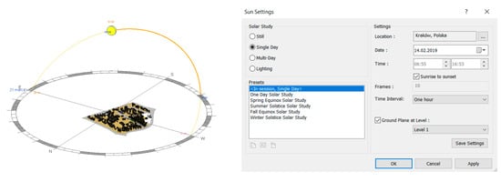 In view of the above, it is advisable to carry out a general analysis of the shadowing in order to determine the areas of impact at the planning stage of the conceptual masses of the buildings. According to the legislation [28] the analysis is carried out on the days of the equinoxes (21st March and 21st September). With the three-dimensional mock-up of a section of the city, the study analysed the shadowing in the Revit software (Figure 7). The program enables the selection of the appropriate location, date and measurement intervals, then it is possible to scroll through the frames with generated shadows at individual intervals.