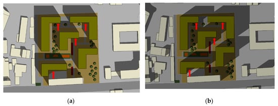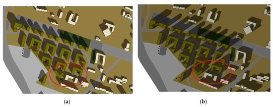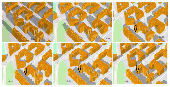 A similar analysis was performed for Example 2, (Figure 10a,b). Within this development, the south-eastern section of the estate and the facades inside the courtyards of each U-shaped segment remain in the shade for most of the day due to dense, high-rise buildings. It is worth noting that the 15-storey buildings generate a particularly large shade zone, overshadowing an area dedicated to public greenery and a place of recreation; in the afternoon this shade zone covers the opposite side of the runway, where it obscures the existing building and the proposed location of other buildings within the same investment. Analysing this area of the development (Figure 11), it is possible to see that part of the south facade (marked by an arrow on Figure 11) is within the shadow of another building as early as 10:00 a.m. and remains in the shade zone for the rest of the day.