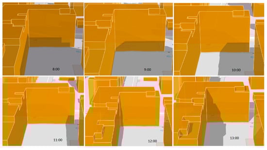 When analysing the hours of sunlight, the model of the southern facade of the worst-located building in Example 1 (Figure 9) was created and the simulation of the sun was carried out for between eight and 13 h. As a research object, the windows located in the least favourable position on the ground floor were chosen, close to the corner of the building. Analysing Figure 9, you will notice that the corners of the building benefit from maximum sunlight from 9:00 (when the shadow cast by the adjacent block subsides) until 12:00 (when the sun passes to the other side of the building).