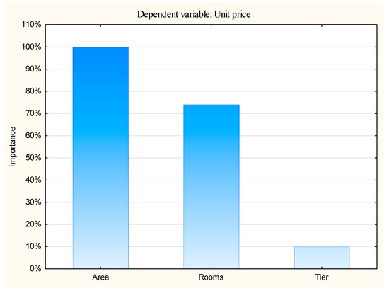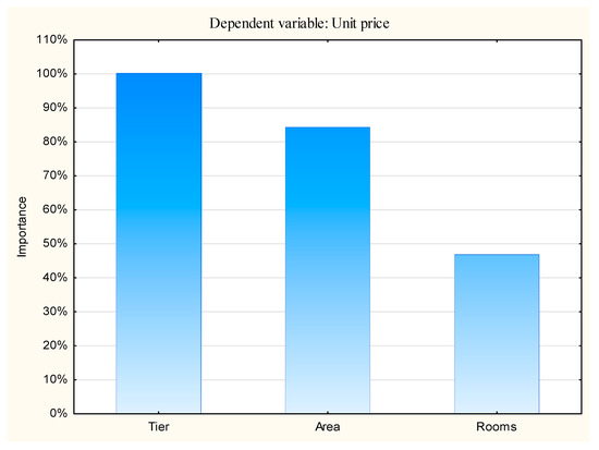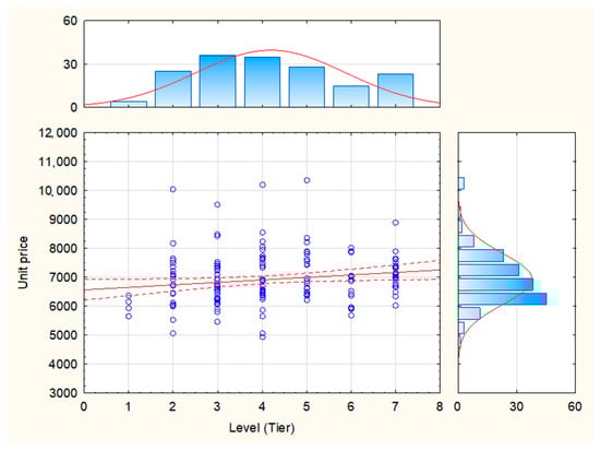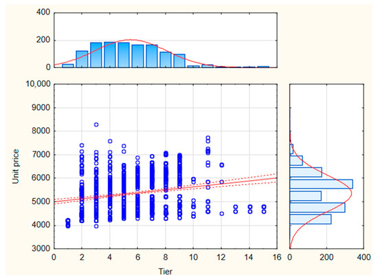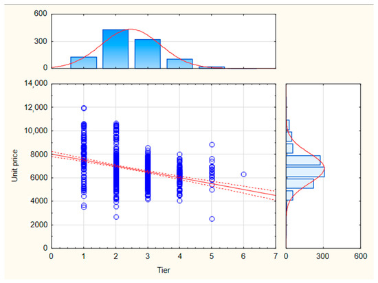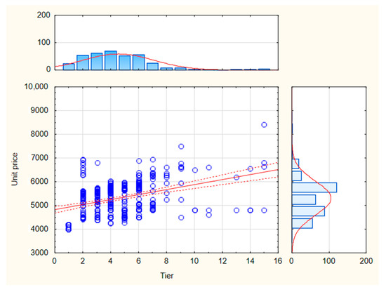 Detailed results of the survey of the relationship between tier and unit price are presented below (Example 1 and its surroundings Figure 12 and Figure 13, for Example 2 and its surrounding area, graphs are shown in Figure 14 and Figure 15) discussing the impact of each characteristic in the area of the investments studied and the whole district.