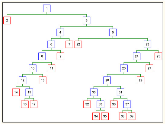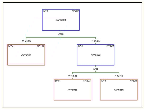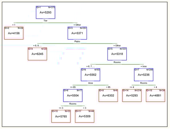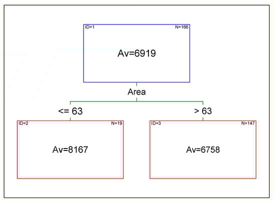 An additional analysis was the creation of C&RT (classification and regression trees, using TIBCO Statistica v 13 software), which used an iterative model for dividing the set into disjointed groups relative to the mean value. The pivoted result is a tree selected in the process of evaluating the model with a 10-fold cross test, as shown in Figure 16 and Figure 17 for Example 1, Figure 18 for the entire Czyżyny district and Figure 19 for Example 2 exclusively. This solution was used so that the floor attribute could be used as a qualitative feature. This assumption allows you to select attractive floors, ignoring the linear nature of the feature. Classic approach-only approximation by the correlation coefficient [31].