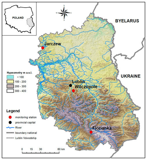 Average one-hour values of automatic measurements of tropospheric ozone concentrations were obtained from three measuring stations belonging to the Chief Inspectorate of Environmental Protection in Poland, operating as part of the Air Quality Monitoring System: the Jarczew station, located in the northwest of the Lublin Voivodeship (φ = 51°48′52′′N, λ = 21°58′21′′E, H = 177 m a. s. l.), the Wilczopole station, located in the centre (φ = 51°09′39′′N, λ = 22°35′49′′E, H = 202 m a. s. l.), and the Florianka station, located in the southern part of the Voivodeship in Roztocze National Park (φ = 50°33′07′′N, λ = 22°58′58′′E, H = 270 m a. s. l.) (Figure 1). The measuring stations were situated in agricultural areas, with the largest city in the region, Lublin, located 90 km from Jarczew, 15 km from Wilczopole, and 95 km from Florianka.
