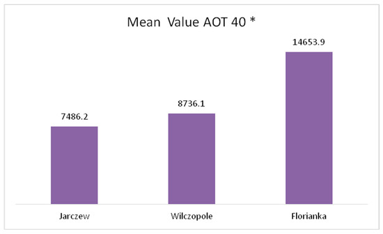 In the present study, carried out in agricultural areas, the tropospheric ozone concentration in the context of crop protection, expressed by the AOT40 parameter, did not exceed the target level of 18,000 μg·m−3·h at any of the measurement stations. The highest mean AOT40 value in 2015–2017 was recorded at the Florianka monitoring station (14,653.9 μg·m−3·h) (Figure 2).