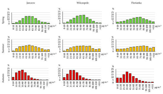 In spring, the most frequent concentrations at the Jarczew and Wilczopole measuring stations were in the range of 41–70 µg·m−3 (over 50%), while concentrations of 51–80 µg·m−3 were most frequent at the Florianka station (over 40%), with maximum concentrations of 61–80 µg·m−3. Concentrations above 111 µg·m−3 were also recorded at all stations in spring. They were noted most often at the Florianka station, located at the highest altitude, with a frequency of nearly 4% (Figure 3).