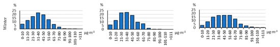 The distribution of concentration frequencies among classes was most even in the summer. Nevertheless, concentrations in higher class intervals from 91 to over 111 µg·m−3 were more frequent in the summer than in other seasons.