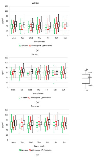 Then the weekly dynamics of ozone concentrations in each season and on each day of the week were determined. Medians and extreme values of concentrations were calculated and presented in box and whisker plots. The whiskers in the top and bottom of the figures correspond to the highest and lowest ozone (O3) concentrations recorded at the measuring stations. The bottom of the box indicates the concentration recorded at a frequency of 25% (first quartile), while the top of the box corresponds to the concentrations that occurred at a frequency of 75% (third quartile). The line inside the box represents the median (second quartile), i.e., the median ozone concentration on each day of the week. Based on one-hour average O3 concentrations, changes in ozone concentrations over 24 h were analysed in each season of the year during the study period.