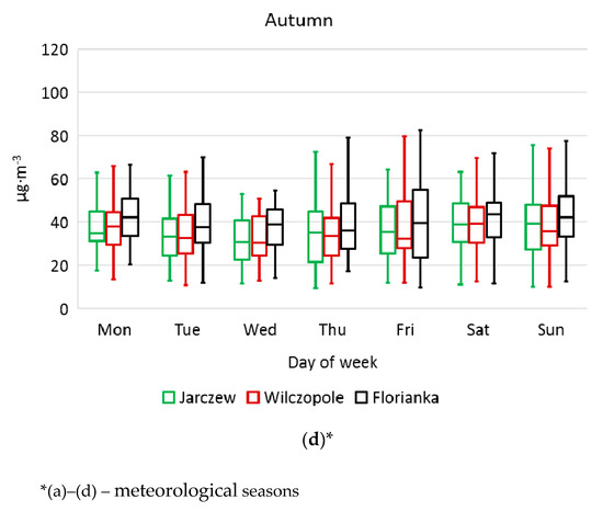 The analysis of average tropospheric ozone concentrations on each day of the week in each season of the year (Figure 4) did not reveal higher O3 concentrations on non-working days (the weekend). On each day of the week, the highest values were recorded at the Florianka station, but no “weekend effect”, which is widely described in the literature, was observed. This effect is mainly observed in cities, while our research was conducted in agricultural areas [77,78,79,80,81]. According to Padusainee et al. [72], the mechanisms of the influence of the weekend on tropospheric ozone formation are still not fully understood and may have multiple causes.
