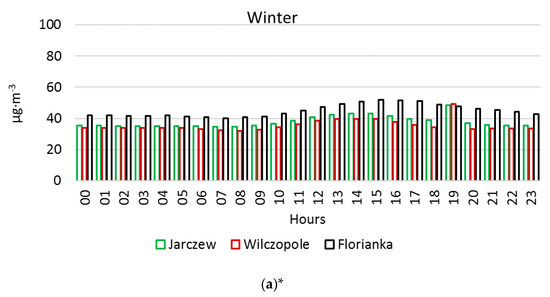 The lowest average ozone concentration (36.0 µg·m−3) was observed in autumn at the Jarczew measuring station (177 m a.s.l.) and in winter (36.4 µg·m−3) at the Wilczopole station (202 m a.s.l.). The widest range of maximum O3 concentrations was observed at the Wilczopole station, with the highest values (178.4 µg·m−3) noted during the summer and the lowest (96 µg·m−3) in winter (Table 3). No O3 concentrations were recorded that would require public notification of the risk of an alert level (180 µg·m−3 one-hour average) or the risk of exceedance of the alert level (240 µg·m−3 one-hour average) at any of the locations in 2015–2017 [64].