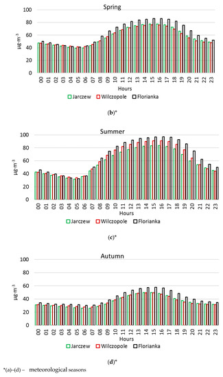 For the analysis of tropospheric ozone concentrations in each season, the values were grouped according to the statistical criterion of 12 class intervals [56]. Ozone pollution at each of the measuring stations was found to be higher during meteorological spring and summer than during winter and autumn (Figure 3).
