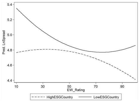 To better investigate potential nonlinearities in the relationship between CSR ratings and loan spreads, we run a second regression analysis splitting our sample into high ESG-rated and low ESG-rated countries. Then, we add in Equation (1) the quadratic term of EW Rating. In order to confirm H2, we should find that in low ESG-rated countries the coefficient of EW_Rating2 is positive and significant. In contrast, in high ESG-rated countries, our hypothesis will be confirmed whether (i) the coefficient of EW_Rating2 is negative and significant and (ii) the interpolating parabola is a decreasing function in the domain of EW Rating.