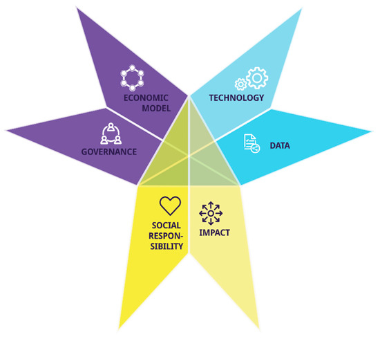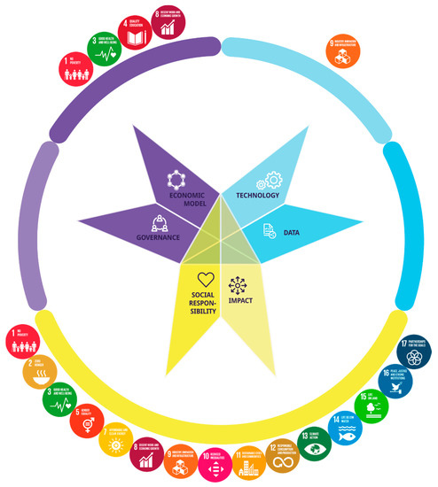 The present work links the democratic qualities of the platform economy [18] to overcome the aforementioned challenges promoted by the SDGs. The Multidisciplinary Balance of Platform Economy [19] enables researchers and policymakers to analyze digital platforms and compare different models by exploring the platform economy initiatives in terms of their democratic and sustainable features. The quality balance examines the economic strategy, governance, technology, data policy, impact, and social responsibility toward platform externalities (Figure 1).