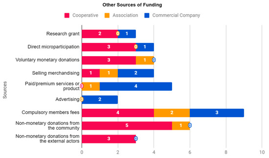 Regarding cooperatives, the most used sources of funding are public funds and non-monetary donations from the community, in five out of eight cases. Other important sources for the cooperatives studied are compulsory members’ fees (four out of eight cases), followed by family savings, non-monetary donations from external actors, monetary donations, and direct micro-participation, all of which are used by three cases. Sources of funding less used by the cooperatives studied were debt investment and research grants (two cases out of eight), followed by equity investment and the sale of merchandising used by one case. Finally, neither advertising nor premium services and/or products are a source of funding for the eight cooperatives studied.