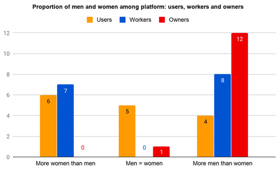In half of the cases studied (10 out of 20), platform workers are unable to work from home, while in seven cases they are. In Figure 4 it is observed that, in 14 out of 20 cases studied, platform managers state that platform workers are earning a salary per hour over the minimum wage, but in the six other cases they were not. Regarding wage equality, quite a polarized ecosystem can be seen. In almost half of the cases studied (nine out of 20), any legal member is earning at least twice as much as other members, and for almost the same number of platforms (eight out of 20), there is at least one legal member who is earning at least twice as much as other members.