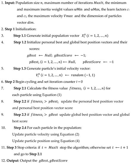 In Equations (2) and (3), t represents the iteration number, and and denote, respectively, the positions of particle i in iterations t and t + 1. The variable w represents the inertia weight that controls the exploration and exploitation phases of the algorithm and c1 and c2 are the learning constants. The variables r1 and r2 are uniformly distributed numbers in the range [0, 1], pBesti and gBest are the best position of particle i and the global best position among all particles, respectively. and are velocities at iterations t and t + 1, which are constrained by the predefined values usually in range of [−Vmax, Vmax].