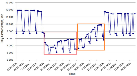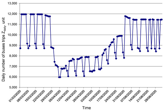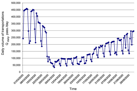 The dynamics of the number of executed bus trips Zdaily in the period of March–June 2020 are presented in Figure 2. Formally, the Tyumen CPPT system switched to a special regime, due to the COVID-19 pandemic on 30.03.2020. This emergency regime continued until 31.05.2020. Therefore, it lasted for nine weeks.