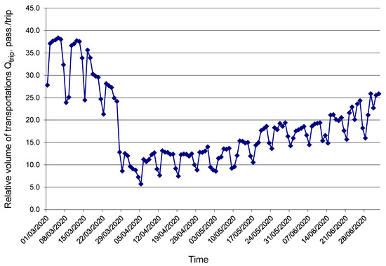 Figure 3 and Figure 4 show diagrams of change in absolute Qdaily and relative Qtrip (as for average bus trips) volume of transportations for the Tyumen CPPT routes in the period from 1.03.2020 to 5.07.2020.
