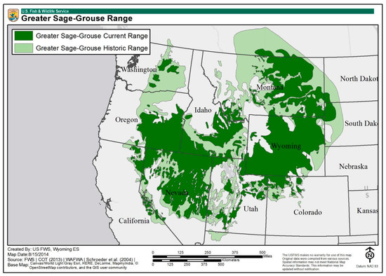 - USFWS. Greater Sage-grouse Conservation in Utah. U.S. Fish & Wildlife Service. 2020. Available online: https://www.fws.gov/greatersagegrouse/factsheets/UTGrSGFactSheet_FINAL.pdf (accessed on 15 May 2020).